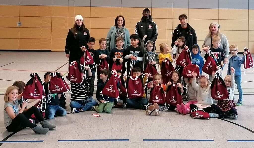 Seit 2019 besucht der FCN jährlich erste Klassen und beschenkt die Kinder. Club-Profi Sadik Fofana, Natalie Scholz von der Club Akademie und Nachwuchsspieler Ben stellten ihren Sport vor und verteilten limitierte Club-Turnbeutel mit vielen verschiedenen rot-schwarzen Überraschungen.