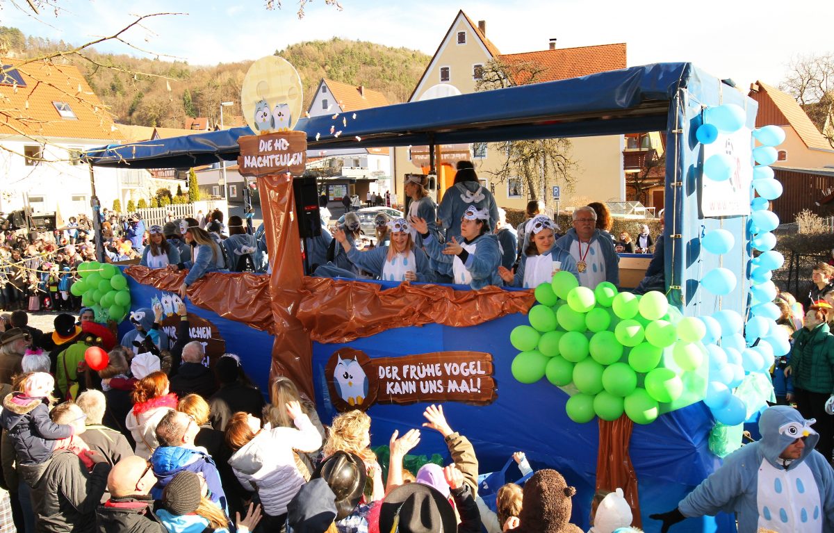 Mit dabei sind auch wieder die örtlichen Handballer. Sie machen als HC-Eulen verkleidet die Nacht zum Tag. Die Idee stammt an sich aus dem Vorjahr. Sie wurde damals „vertagt“, weil die Deutsche Handball-Nationalmannschaft kurz davor die Europameisterschaft gewonnen hatte. Die Sportler dekorierten deshalb ihren Wagen schwarz-rot-gold und feierten den Titelgewinn beim Gaudiwurm.