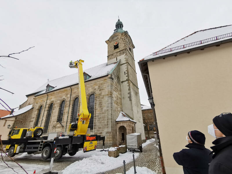 Also machten er und Kappler sich bei Firmen für Hubsteiger schlau. Mit dem Unternehmen Wagert, das Erfahrung bei Gotteshäusern mitbringt, kamen sie ins Geschäft. „Die Kosten von rund 1000 Euro übernimmt der Kirchbauverein“, erzählt Kappler. Damit sei die Aktion schneller möglich gewesen als wenn alles über den Kirchenvorstand gegangen wäre, ergänzt Lichteneber.
