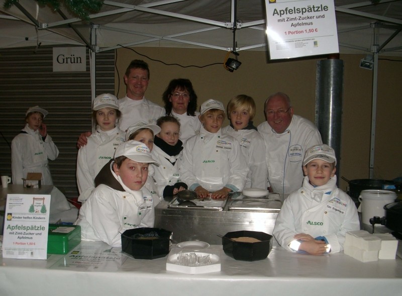 SPALT — Schwerstarbeit erwartete die Hersbrucker Miniköche beim Spalter Weihnachtsmarkt. Gemeinsam mit ihren kleinen Kollegen aus Abtsgmünd, Ulm, dem Ostalbkreis und Spalt verwöhnten die kulinarischen Botschafter der Citta slow die vielen hundert Besucher des über die gesamte Altstadt verteilten Marktes mit Herzwaffeln am Stiel und Apfelspätzle. Mit ihren Begleitern Thomas und Ruth Hannes (hinten links) gossen Dominik, Oskar, Julian, Kia, Stella und Tim gut 36 Liter Teig auf die Waffeleisen und bereiteten knapp 15 Kilo Apfelspätzle zu. Der Erlös ihrer Anstrengungen kommt der Stiftung „Kinder helfen Kindern“ zugute. Minikoch-Erfinder Jürgen Mädger (2. v. rechts) hatte für die Hersbrucker übrigens eine tolle Überraschung parat – ihre „alte“ Kollegin Lisbeth Zimmerschitt (links), die ihre Ausbildung in Hersbruck begann und nach einem Umzug nach Aalen inzwischen in der Ostalbkreis-Gruppe von Mädger den Kochlöffel schwingt. Nach ein paar Tagen Ruhe geht es für die Miniköche am nächsten Wochenende in die Bundeshauptstadt Berlin, wo sie Hersbruck erneut auf einem Weihnachtsmarkt lukullisch vertreten und anschließend in einem Kaufhaus einen gemeinsamen Termin mit dem früheren Boxer und Fackelmann-Werbeträger Axel Schulz wahrnehmen. kp/Foto: privat