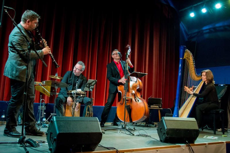 Harfe, Kontrabass, Trompete, Klarinette und eine ganze Reihe weiterer Instrumente brachte die Gruppe mit auf die Bühne und bewies, dass die Kombination Virtuosität und Experimentierfreude niemals langweilig wird. Mindestens ebenso markant wie die Harfe war die Klarinette von Matthias Klimmer, die für reichlich Klezmer-Feeling im „bairischen Kammersound“ sorgte.