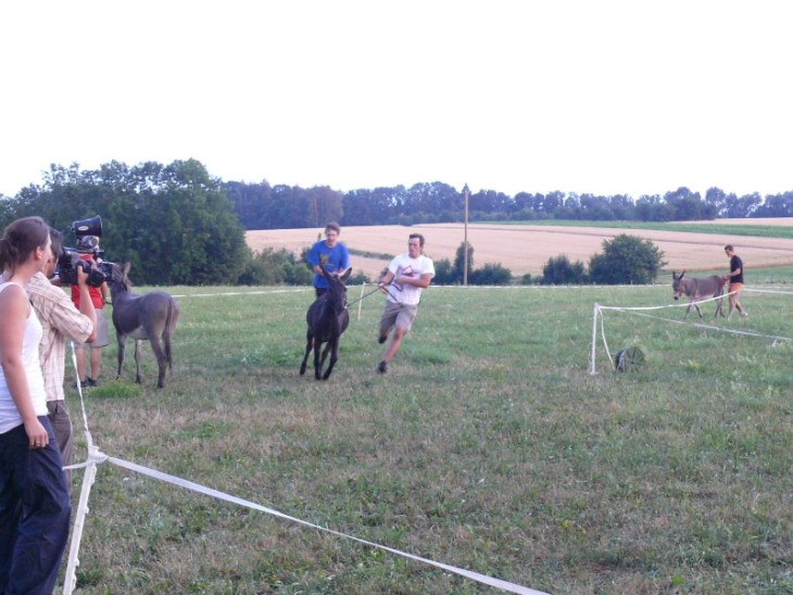 Tierbesitzer Ina und Gottfried Wölfel sehen mit kritischer Miene zu und geben hier und da Tipps: „Nie die Leine um die Hand wickeln“, wird Tobias Ehrmann von Ina ermahnt. „Wenn du stürzt und nicht loslassen kannst, kann das böse Folgen haben.“ Auch die Übergabe der Esel an den nächsten Läufer muss geübt werden. Nikki und sein Treiber kommen in Windeseile auf Tobias zu, der nun an der Reihe ist. So schnell wie möglich muss er die Leine übernehmen, aufpassen dass er dem Esel nicht im Weg steht und ihn womöglich ausbremst und loslaufen. Das Wichtigste: nicht hinfallen!
