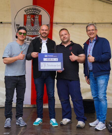 Die Organisatoren Moritz Kellner von der „Mahlzeit“ (links) und Jan vom „Brauhaus“ (Zweiter v. rechts) übergeben gemeinsam mit Bürgermeister Robert Ilg (rechts) den Spendenscheck an Maurizio Schneider, Vorsitzender des Kreisjugendrings. | Foto: Social Media einfach2025/04/image0-scaled.jpeg