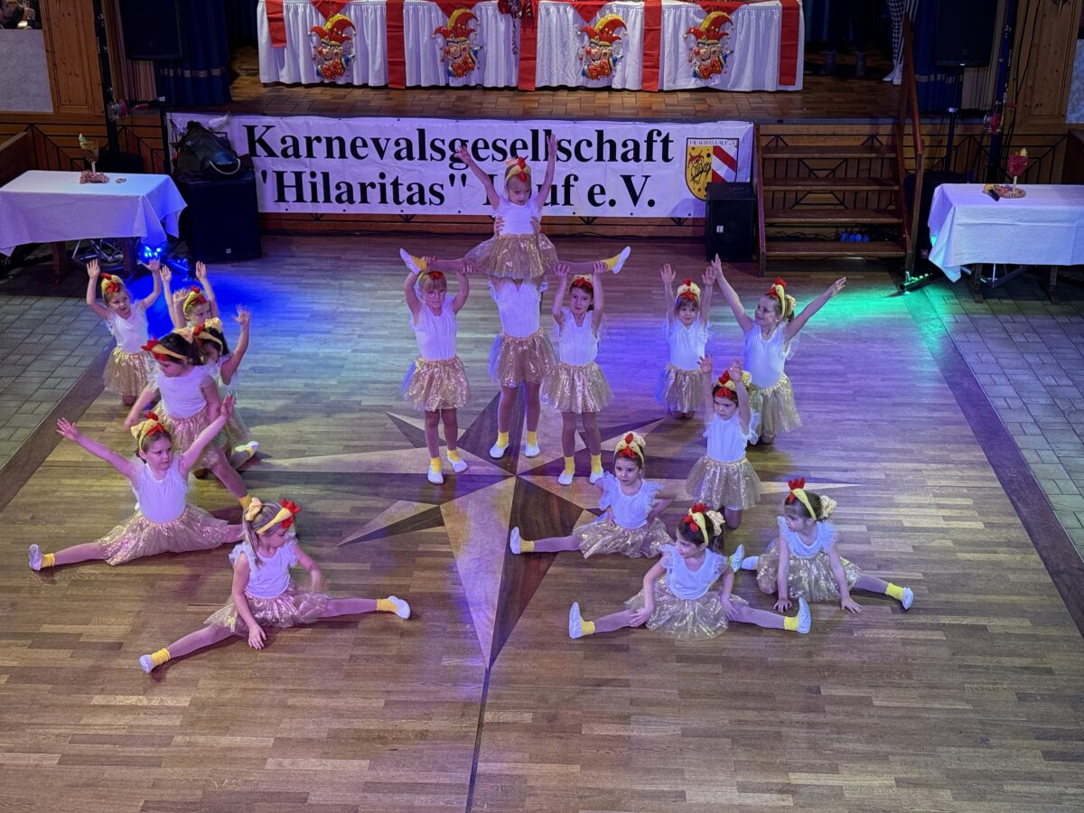 Die tänzerische Eröffnung übernahm die Kindergarde mit einem Marschtanz, um die Bühne dann den jüngsten Tänzerinnen, den „Wuzzerla“ zu überlassen. Als „wilde Hühner“ ließen sie die Herzen des Publikums dahinschmelzen.