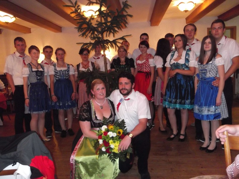 Als der Regen am Abend immer noch nicht nachgelassen hatte und somit das geplante Austanzen unmöglich wurde, entschlossen sich die Kirwaleut spontan nochmals loszuziehen und einen neuen Baum für das Austanzen im Gasthaus zu holen. Ein geeignetes Objekt war schnell gefunden, ein neuer Miniaturkranz wurde gebunden und durch einen eilends besorgten Christbaumständer war auch das Aufstellen kein Problem. Bei der ersten „Stöppacher Indoor-Kirwa“ wurden Silke Schurath und Philipp Pusch das glückliche Oberkirwapaar. Den Ausklang des Wochenendes bildete der zünftige Frühschoppen am Montag. Bei Musik, Salzknöchle und Kirwamaßen wurde noch lange über ein aufregendes Wochenende gesprochen.