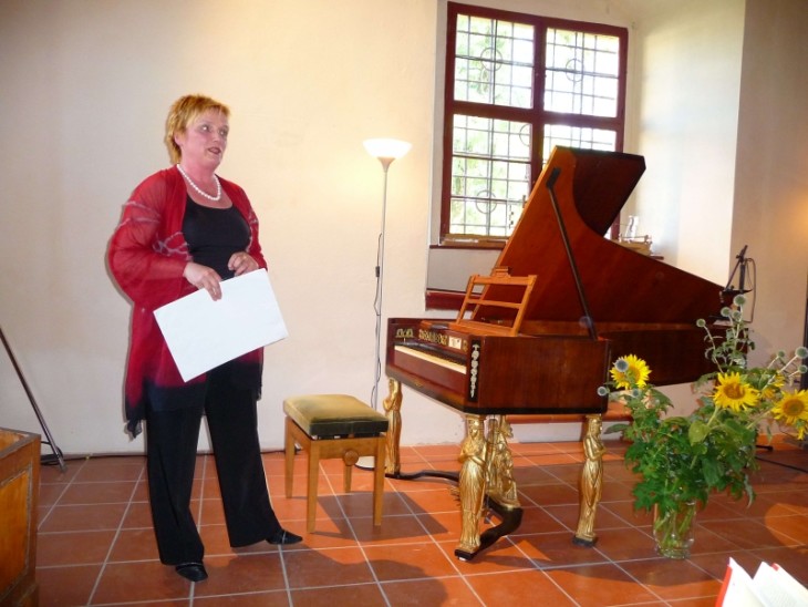 Wolfgang Riedelbauch dankte für den zahlreichen Besuch. Sohn und Tochter von Wolfgang Riedelbauch erhielten den ersten Preis für die Gestaltung eines Klaviertisches und Keramik. Auf verschiedenen Hammerflügeln interpretierte Christine Schornsheim ihre Vortragsfolge. Von Giovanni Benedetto Platti (1697 – 1763) erklang die dreisätzige Sonate c-Moll, op. 4/5. Platti bezeichnet man als Wegbereiter zur Klassik. Der langsame Satz verströmt Lyrik und würdige Größe, die raschen Sätze sprühen von Temperament und Geist; von der Pianistin empfindsam vorgetragen. Perlende Läufe und Arpeggien, sogar auf Tonrepetitionen sprach das Instrument an.