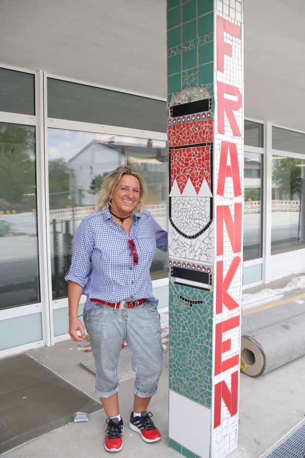 „Professionelles Fliesenzerdeppern“ nennt die 50-Jährige ihre Kunst scherzhaft. Denn natürlich muss erst einmal etwas kaputt gehen, damit man es neu zu einem bunten Kunstwerk zusammensetzen kann. So sind auch die goldenen Sterne der Europaflagge, der Frankenrechen oder das Wappen des Nürnberger Lands auf den Säulen am Pausenhof der Kunigundenmittelschule entstanden. Alles zusammengesetzt aus unterschiedlich großen, farbigen Fliesenstücken, ergänzt mit Kronkorken, Spiegelstücken oder Geschirrteilen. „Für die bayerische Säule musste sogar meine Lieblingstasse dran glauben“, sagt Rauh und lacht.