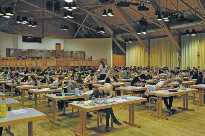 RÖTHENBACH/LAUF — 114 Schüler der Realschule am Fränkischen Dünenweg in Röthenbach und 94 in der Laufer Oskar-Sembach-Realschule sitzen seit dem gestrigen Mittwoch über ihren schriftlichen Abschlussprüfungen. Angefangen mit Französisch, über Deutsch (wie hier im Bild am heutigen Donnerstag in der Karl-Diehl-Halle in Röthenbach), Englisch, Mathematik, Betriebswirtschaftliches Rechnen und Physik bis hin zum Sozialwesen zieht sich der Prüfungsmarathon für die Teenager bis Freitag kommender Woche hin. Deutsch, Englisch und Mathe sind Pflichtfächer, dazu müssen die Schüler sich noch für ein weiteres Fach entscheiden. An beiden Bildungseinrichtungen im PZ-Gebiet hoffen die Schulleiter darauf, dass alle Schüler bestehen. „Ich warte darauf, mir einmal ein 100-Prozent-Schild umhängen zu können“, sagt Peter Müller, Direktor in Röthenbach. Aber ein oder zwei Schüler scheitern meist an den schriftlichen Prüfungen. „In der Regel gibt es immer jemanden, der es nicht schafft“, sagt auch Martin Massuthe, Direktor der Oskar-Sembach-Realschule. Bayernweit treten heuer über 40 000 Realschüler zu ihren Abschlussprüfungen an. Foto: Kirchmayer