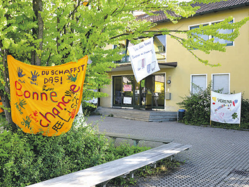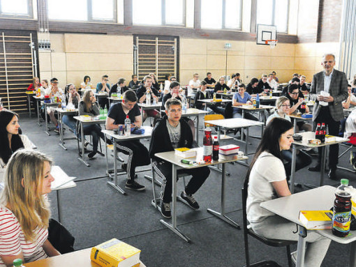 LAUF/RÖTHENBACH — Für alle Realschüler hat gestern der Endspurt zur mittleren Reife begonnen. Nach dem Auftakt im Wahlpflichtfach Französisch am Mittwoch mussten sich gestern dann erstmals zugleich alle 218 Prüflinge in Lauf und Röthenbach im ersten Pflichtfach beweisen. In Deutsch mussten sie entweder eine Erörterung oder einen textgebundenen Aufsatz schreiben – die 118 Oskar-Sembach-Realschüler in der neuen Turnhalle (Bild rechts) am Nordring, die 100 Röthenbacher von der „Realschule am Fränkischen Dünenweg“ in der Karl-Diehl-Halle. Sie alle hatten maximal vier Stunden Zeit. Neben Deutsch sind Englisch und Mathematik die weiteren Pflichtfächer. Außer der zweiten Fremdsprache Französisch hatten die Abschlussschüler – je nach Zweig – unter anderem noch die Wahl zwischen Sozialwesen, Physik oder BWR (Betriebswirtschaft und Rechnungswesen). Eine Besonderheit in diesem Jahr ist die Unterbrechung der Prüfungszeit durch die Pfingstferien, so ist der Marathon für die Schüler erst nach drei Wochen beendet. Natürlich fiebern auch die Eltern und Geschwister mit. In Lauf ist das nicht zu übersehen: Wie es bereits seit einigen Jahren zur Abitur-Zeit am CJT-Gymnasium der Brauch ist, ist jetzt auch der Pausenhof und Eingangsbereich der Realschule mit motivierenden Plakaten geschmückt (links). Fotos: Scholz