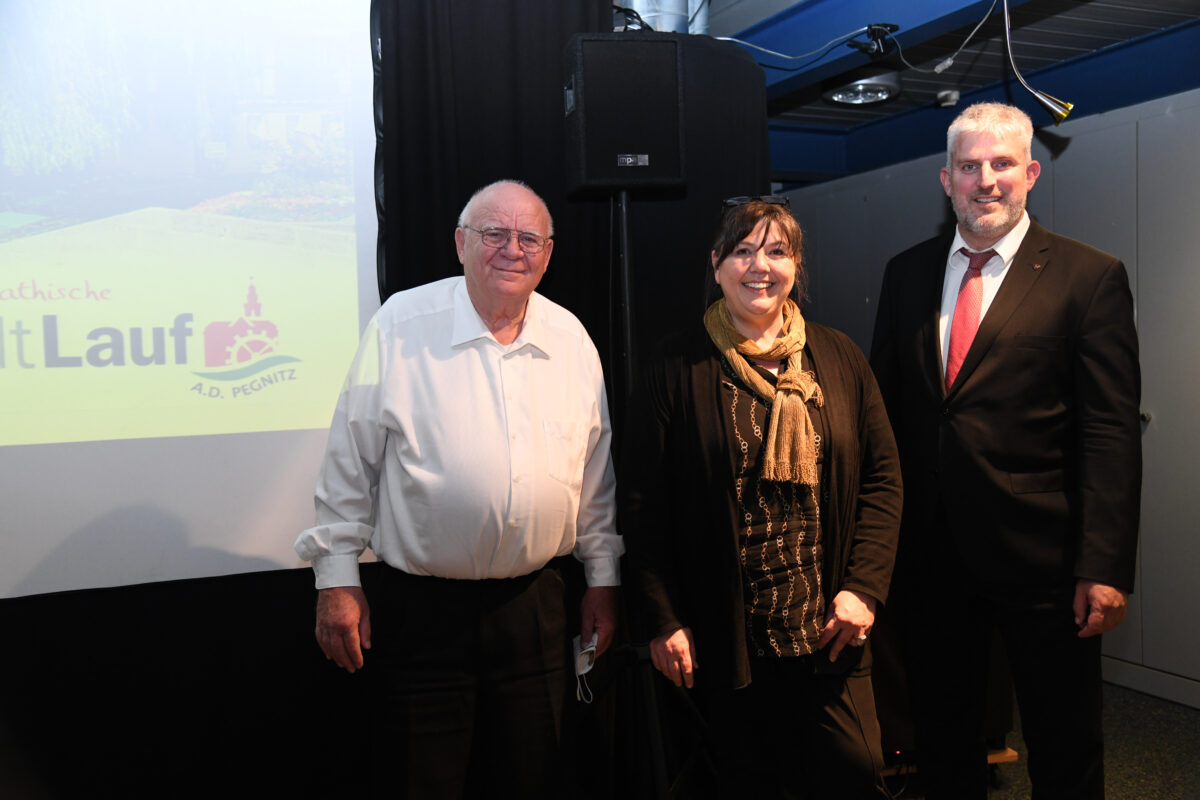 Laufs Seniorenbeauftragter Adolf Pohl (links), Psychogerontologin Sabine Distler und Bürgermeister Thomas Lang bei der ersten Seniorenbürgerversammlung im PZ-Kulturraum. | Foto: Miehling2021/11/seniorenburgerversammlung-lauf.jpg