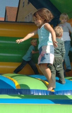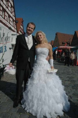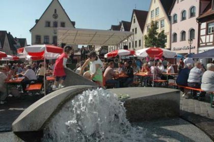 LAUF (jz) – Die Zahl 13 bedeutete für das Laufer Brunnenfest kein Pech, ganz im Gegenteil. Die 13. Auflage des Festes auf dem Marktplatz war wohl eine der erfolgreichsten überhaupt. Das schöne Wetter am gestrigen Sonntag lockte die Besucher in Scharen, in kurzer Hose und im T-Shirt ließ es sich auf den Bierbänken (mittleres Bild) und in den umliegenden Cafés und Restaurants höchste gemütlich sitzen oder durch die Geschäfte flanieren. In der ganzen Stadt waren die Läden geöffnet und viele nutzten die Gelegenheit zu einem Schaufensterbummel. Zahlreiche Geschäfte hatten sich außerdem Aktionen für ihre Kunden einfallen lassen: ein Optiker bot kostenlos Brillenreinigungen und kleinere Reparaturen an, die Mitarbeiter einer Apotheke maßen den Blutzuckerspiegel, ein Silberschmuckverkäufer hatte gratis Ring-Innengravuren im Programm. Die Laufer Stadtwerke informierten an einem Stand, ebenso wie einige auswärtige Unternehmer. Einiges Aufsehen erregten auch Katharina und Ray (linkes Bild): die beiden haben zwar schon vor einigen Monaten geheiratet, hatten sich aber noch einmal in Schale geworfen und warben am Brunnenfest in voller Hochzeits-Montur für einen Trauring-Hersteller. Während sich die Eltern die verschiedensten kulinarischen Angebote schmecken lassen konnten, waren für die kleinen Gäste eine Hüpfburg (rechtes Bild) und ein Miniatur-Kettenkarussell aufgebaut. Fotos: Ziegler
