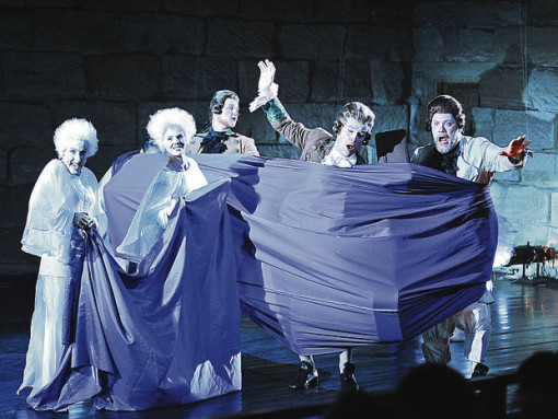 Vor einer kleinen Insel irgendwo im Mittelmeer zwischen Mailand und Neapel. Blaue Tücher, gelenkt von weißen tänzerischen Gestalten, wallen und flattern auf der Bühne und versetzen fein gekleidete Herren in Angst und Schrecken. Immer wieder knallt ein Feuerblitz.