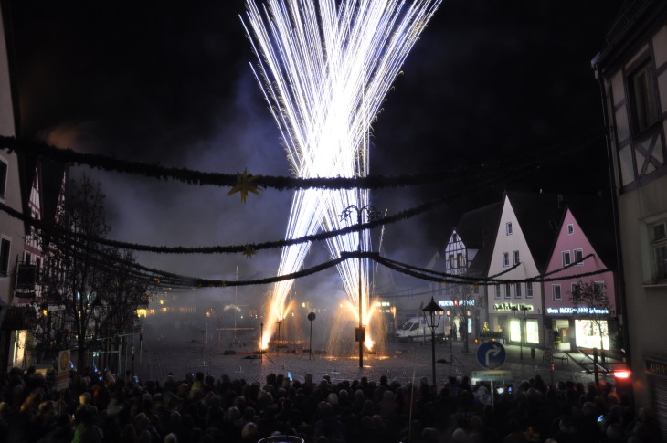 LAUF — Wenn am dritten Adventssonntag langsam die Dunkelheit über Lauf hereinbricht, ist der Marktplatz jedes Jahr gefüllt mir erwartungsfrohen Gesichtern. Denn Jung und Alt möchte beim traditionellen Barockfeuerwerk dabei sein. Zum 25-jährigen Bestehen des Laufer Weihnachtsmarktes sollte das Feuerwerk heuer besonders spektakulär werden, versprach Horst Fischer, der Vorsitzende des Weihnachtsmarktes, bereits im Vorfeld. Und er hielt Wort. Prächtige Römische Lichter erleuchteten den Himmel über Lauf, Vulkane sprühten meterhoch, auf Metallgerüsten drehten sich Sonnenräder. Dazu liefen Weihnachtslieder und bekannte Klassiker wie „Hallelujah“. Mindestens tausend Besucher bestaunten die fünfzehnminütige spektakuläre Feuershow einer Firma aus Neumarkt. Der Laufer Marktplatz wurde von 21 Feuerwehrmännern und einer Feuerwehrfrau aus Lauf und Schönberg gesichert.
