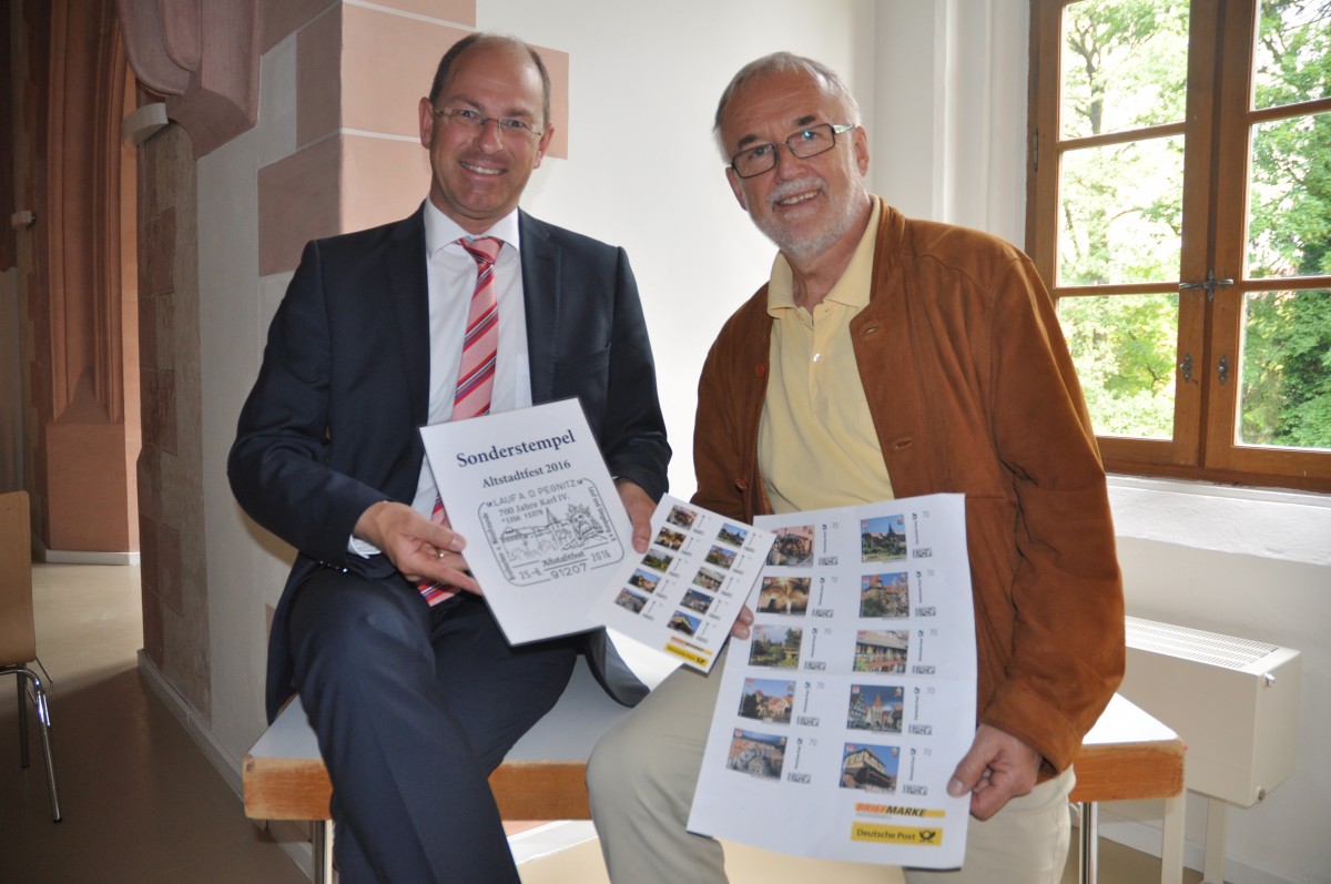 Andreas Ellner (re.), Vorsitzender der Laufer Briefmarkenfreunde, und Bürgermeister Benedikt Bisping präsentieren die Laufer Sondermarken und den Sonderstempel.
