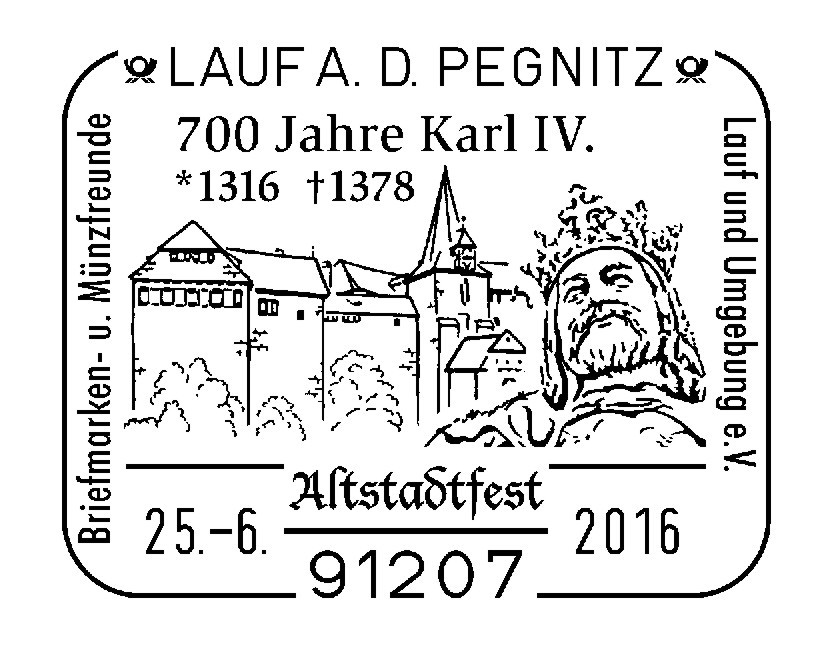 Ein besonderes Schmankerl für Philatelisten und Lokalpatrioten gibt es dann noch am Laufer Altstadtfest: Am Samstag, 25. Juni, können sie sich im Stadtarchiv von 10 bis 17 Uhr ihre Post oder auch ein Blankokuvert zusätzlich noch mit einem Sonderstempel zum Karl-Jubiläum versehen lassen.