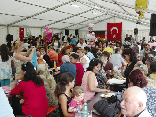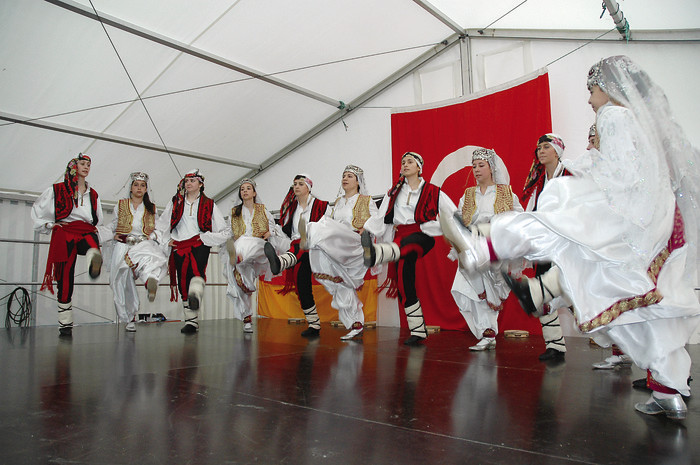 LAUF — Zum zweiten Mal feierten die Laufer Türken am Wochenende auf dem kleinen Parkplatz Pegnitzwiesen ihr großes „Türkisch-Deutsches Sommerfest“. Hunderte von Besuchern drängten sich im Zelt (Mitte) und um Stände, an denen türkische Spezialitäten von Döner bis Baclava feilgeboten wurden. Auf der Bühne zeigten Folkloregruppen ihr tänzerisches und musikalisches Können, zum Beispiel die des Türkisch-Deutschen Elternvereins Hersbuck (oben). Die Kleinen konnten sich in und um eine Hüpfburg vergnügen (unten). Höhepunkt des Festes war allerdings wie schon im Vorjahr ein bunter Festzug, der sich am Sonntagnachmittag vom Marktplatz in Richtung des Festgeländes auf der Pegnitzwiese bewegte – angeführt von einer 40 Mann starken osmanische Militärkapelle. Fotos: Ziegler