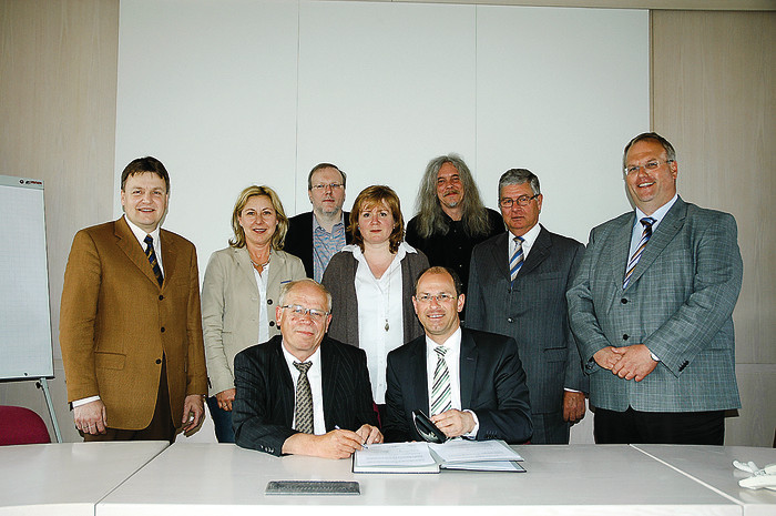 Keine großen Fans der Mittelschule, aber guter Dinge: Die Bürgermeister Georg Brandmüller und Benedikt Bisping (vorne) setzen ihre Unterschrift unter den Kooperationsvertrag zwischen Lauf und Schnaittach. Mitunterzeichner sind (hinten v. l. ): Klaus Falk, Gabriela Scheicher, Werner Wagner, Cornelia Schindler, Rüdiger Brix, Kurt Sägmüller und Perry Gumann. Foto: Scholz2011/05/21217_New_1304498164.jpg
