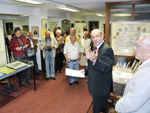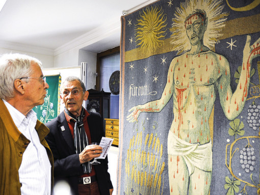 In diesen Zusammenhang konnte man bei der Vernissage im Archiv eine besondere Begegnung erleben. Griebels Sohn Peter, der mit seiner Frau zur Eröffnung nach Lauf gekommen war, erfuhr von dem engagierten evangelischen Laufer Kirchenmann Willy Adam Datails zum Auftrag und Ankauf des Griebelteppichs durch die Laufer Kirchengemeinde. Und dann fachsimpelten die beiden Männer über das ausgestellte Kunstwerk.