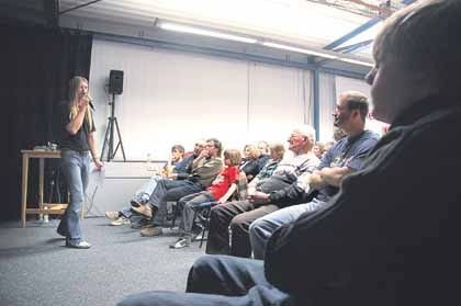 Einige Besucher reizte es in der Pause, das vor der Leinwand stehende Originalrad sich genauer anzusehen oder kurz zu berühren, während sein Besitzer und dessen Gefährten bereitwillig Fragen zu dem sechswöchigen Trip beantworteten.