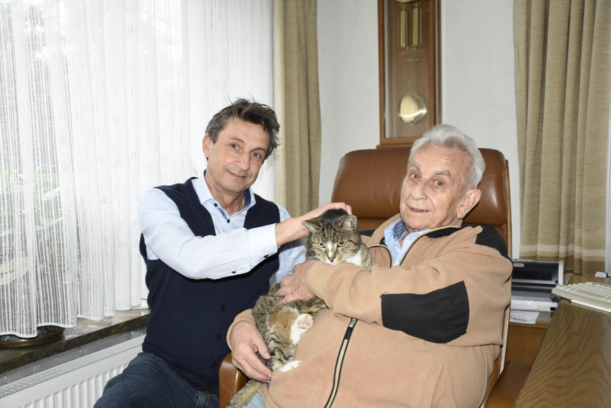 Franz Dramont und sein Sohn Frank Dramont freuen sich, dass Kater Max in seinem Zuhause am Laufer Südring bleiben darf. Vor 14 Jahren ist der Kater hier geboren worden. | Foto: Andrea Beck2021/12/Franz-und-Frank-Dramont-Lauf-151221-Foto-Beck-scaled.jpg