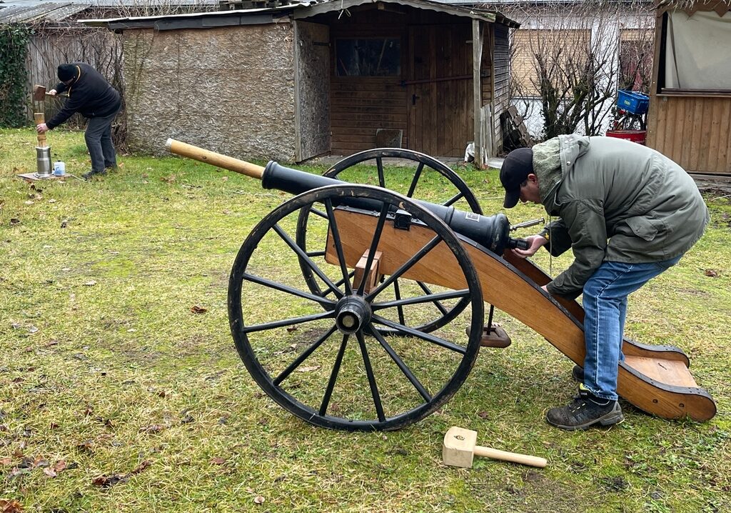 Die Böllerschützen des DSKB Speikern/Neunkirchen laden hier einen Standböller und eine Kanone. Das Bild zeigt Böllerkommandant Roland Bezold (links) und Böllerschütze Matthias Liehr. | Foto: Klaus Bock2024/01/Boellerschuetzen.jpeg