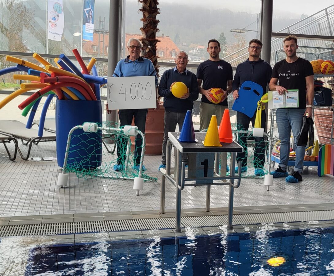 HERSBRUCK – Bruno Meyer und Georg Fleischer vom Verein „Schwimmen in Hersbruck“ übergaben 4000 Euro zur Förderung des Schwimmunterrichts und Unterstützung der Jugendarbeit an Sportlehrer und Wasserwacht.