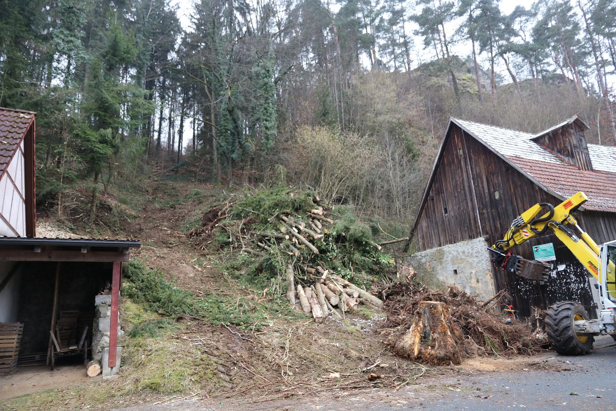 NEUHAUS – Am Neuhauser Burgberg haben die Arbeiten im Rahmen der Grundsanierung der Burg Veldenstein an Fahrt aufgenommen. In diesen Tagen wurde mit dem Holzeinschlag für die Verlegung der Oberflächenwasserleitung von der Burg hinunter zur Pegnitz begonnen.