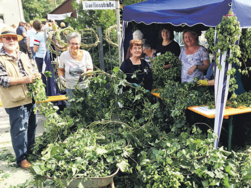 Auf dem Gelände zwischen „Fränkischer Hopfenscheune“ und dem Bauernhof des „Simmersbauern“ gab es fast kein Durchkommen mehr. Schon der Spaziergang durch die Kersbacher Straße hinauf mit diversen Handwerkerständen versetzte in die „gute alte Zeit“. Im Museumsgarten gab es dann reichlich Speis und Trank und vieles mehr, alles organisiert von etwa 80 Mitgliedern und weiteren Helfern des Heimat- und Geschichtvereins. Aufgestellte Schautafeln gaben vielfältige Hinweise auf die alte Hopfenkultur. Auch hier waren Stände und am Eingang des Gartens werkelten Frauen im Akkord, um alle Wünsche nach einem duftenden Hopfenkranz oder -strauß zu erfüllen.