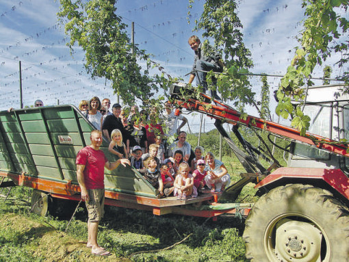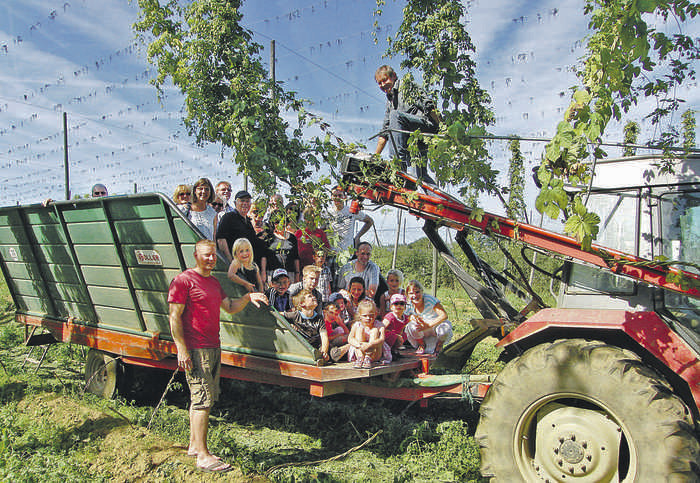 Mit Landwirt Gerhard Merkl zum Hopfengarten zu fahren, war besonders für die Kinder ein Erlebnis. Halbstündlich ging es hinaus aufs Feld. Dort erfuhren sie, dass im Sinnspruch „Der Hopfen will jeden Tag seinen Herrn sehen“ viel Wahrheit steckt, denn das Arbeitspensum eines Hopfenbauern ist gewaltig.