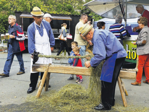 Hans Blank demonstrierte das Dengeln von Sensen und Sicheln. Wie man aus Seegras ein Seil erzeugt, wie es früher zum Binden von Korngarben verwendet wurde, konnte bei Lorenz Scharnagel abgeschaut werden. Da machte nicht nur das Zuschauen Spaß – beim Buttern oder beim Herstellen eines Strickes aus Sisal oder Hanf durften die Besucher auch selbst mal Hand anlegen.