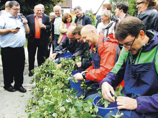 Beim Hopfenfest hat natürlich das richtige „Hopfenzupf`n“ schon Tradition. Fritz Kroder bediente die Stoppuhr, als Männer wie Frauen beim Hopfenpflück-Wettbewerb ausprobierten, wer in zwei Minuten die meisten Dolden abzupft. Die schnellsten Finger hatten Sabine Raschendorfer (128 Gramm) und Uwe Schlenk (105).