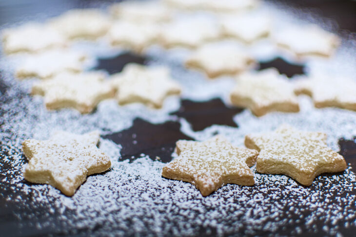 Die Plätzchen ca. 9-10 Minuten backen, bis sie an den Kanten leicht gebräunt sind. Abkühlen lassen und mit Birkenpuderzucker bestäuben.
