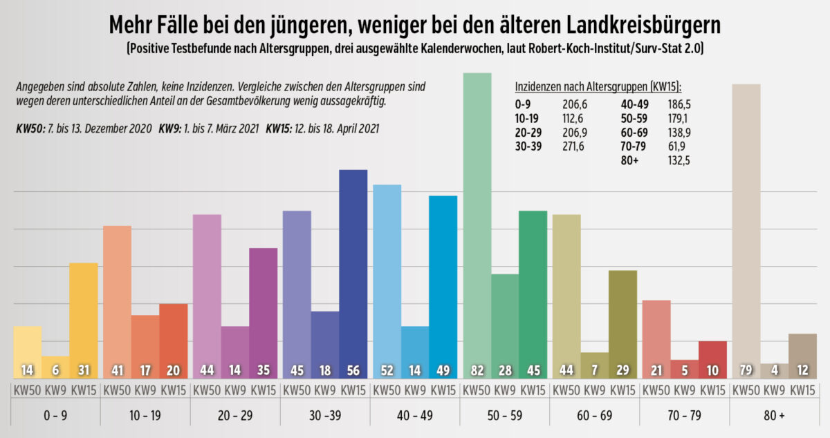„Getragen“ wird die derzeitige Infektionswelle vor allem von den 20- bis 39-Jährigen, den 50- bis 59-Jährigen und von Kindern. Wobei Vorsicht bei der Deutung der Zahlen angebracht ist: Während Tests am Arbeitsplatz freiwillige Angebote sind, müssen sich die Schüler von Abschlussklassen zweimal pro Woche testen lassen, wenn sie am Präsenz­unterricht teilnehmen wollen. Das Dunkelfeld ist hier also kleiner. Andere Jahrgänge sind derzeit wieder im Distanzunterricht. Womöglich liegt es daran, dass die Inzidenz in der Altersgruppe 10 bis 14 von zwischenzeitlich um die 200 auf aktuell 82,5 (KW 15) gesunken ist. Zu Hause wird eben weniger getestet.