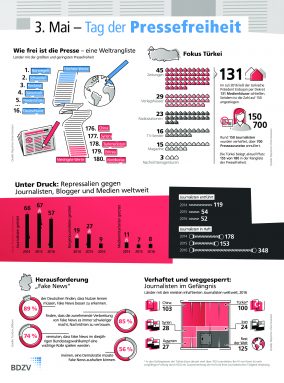 Der Bundesverband Deutscher Zeitungsverleger hat zum Tag der Pressefreiheit am 3. Mai zusammen mit Yoko Ono eine Kunstaktion initiiert. Im Kurz-Interview gibt sie ein Statement zu ihrer künstlerischen Grafik ab, die hier (links) zu sehen ist. Darauf steht: „free you, free me, free us, free them“. Das zweite Bild (unten) zeigt in Zahlen und grafischer Darstellung, wie es global um die Pressefreiheit bestellt ist.