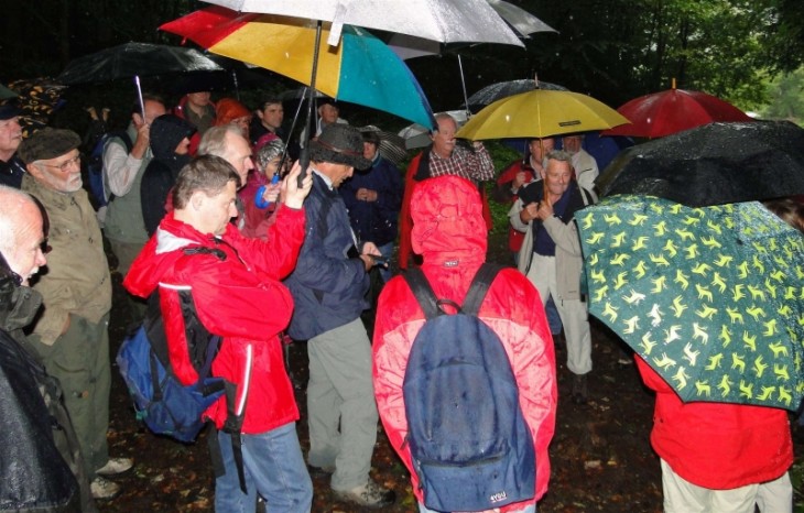 OFFENHAUSEN – Trotz Dauerregens folgten 30 interessierte Bürger aus der Gemeinde und der Region der Einladung von Kreisheimatpfleger Robert Giersch eine ganztägige archäologische Exkursion im oberen Hammerbachtal (Gemeinde Offenhausen) zum Thema „3000 Jahre Kuturlandschaft Hammerbachtal“ im Rahmen der Entdeckertage wahrzunehmen. Vom Offenhausener FFW-Haus ging die Tour Richtig Prosberg zum Höhenzug „Lindenbühl“. Während der über fünf stündigen frühgeschichtlichen Wanderung (nur unterbrochen durch eine Mittagsrast im Gasthaus Niebler in Kucha) zeigte Robert Giersch markannte, oft übersehene Zeugnisse der früheren Talbewohner. So boten die Hänge links und rechts im Hammerbachtal ertragreiche Eisenerzvorkommen, mit einem durchschnittlichen Erzanteil von rund 22 Prozent lohnte sich in der Frühzeit der Abbau auch in unseren Breiten. Neben unscheinbaren Hügeln oder Taleinschnitten an denen man sonst oft achtlos vorüberspaziert, zeigte Giersch mitten im Wald, an markanten frühgeschichtlichen Plätzen mit einem handlichen Beamer Bilder die, an einen Regenschirm projektziert, Fundstücke zeigten, die bei vorausgegangenen Ausgrabungen gefunden wurden. Oben am „Lindenbühl“ befindet sich auch eine aus 25 Hügelgräbern befindliche Anlage aus der Mittelbronzezeit, also wohl aus dem 16. Jahrhundert vor Christus. Auch weitere Hügelgräber im oberen Hammerbachtal, die auf eine frühe Besiedelung hinweisen, wurden beschrieben: Bei Oberndorf bei Kucha befand sich an der Straße nach Traunfeld sogar eine Turmburg, von der aber leider keine großen Zeugnisse mehr übriggeblieben sind, nur der Turmhügel ist erkennbar. Bei Beendigung der langen, aber vor allem ereignissreichen Exkursion mit den Kreisheimatpflegern waren sich alle Teilnehmer schnell einig, in einer wirklich lebenswerten Kuturlandschaft zu leben. Foto: R. Wacker
