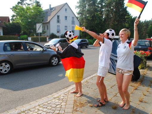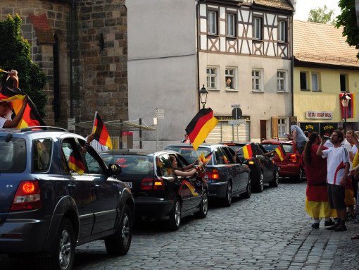 Bezeichnend für die Freude der Fußballfans allerorts war der Trubel auf dem und um den Laufer Marktplatz direkt nach dem Spiel. Alle Straßen waren mit Autos dicht, schwarz-rot-goldene Fahnen in allen Varianten wehten, Vuvuzelas dröhnten, Autos hupten, „Schland“-Gesänge waren überall zu hören. Jeder, der absichtlich oder zufällig des Weges kam, feierte mit.