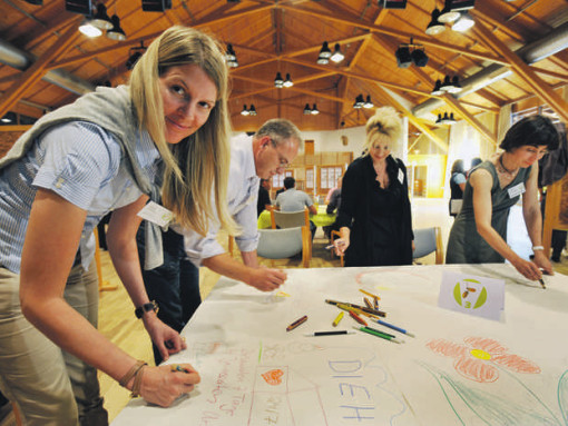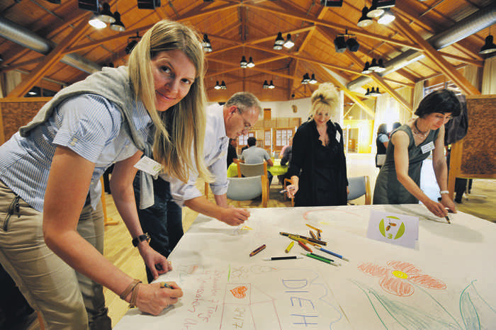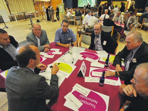 Rund 75 Persönlichkeiten – Banken- und Unternehmensvertreter, Mitarbeiter von sozialen Einrichtungen, Politiker und Kirchenleute – sind gekommen, um den „Markenentwicklungsprozess“, der ein ganzes Jahr dauern soll, anzustoßen. In kleinen Gruppen sitzen sie um Tische, hantieren mit Zetteln und malen auf große Papierbögen, was ihnen spontan zum Nürnberger Land einfällt.