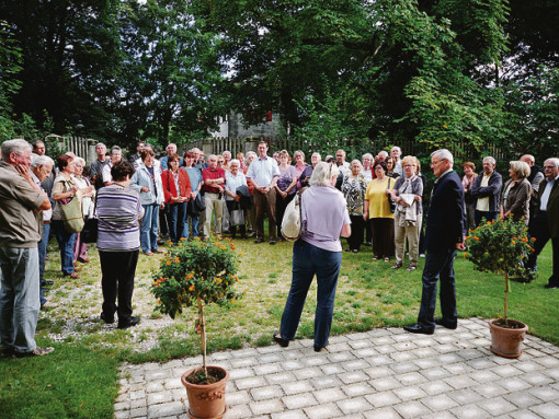 Geschmackvolle Prächtigkeit empfing die Besuchergruppe nach Durchschreiten des Tores. Die Mieter der Nebengebäude und Bolko von Oetinger selbst haben die Schlossanlagen in Abstimmung gestaltet, mit Blumenakzenten und kleinen Sitzgruppen. Inmitten der kurzgeschnittenen Grünfläche im Zentrum prangte das Schloss im Abendlicht. Fachkundig, aber gleichwohl verständlich und unterhaltsam erzählte Bolko von Oetinger von der jüngsten Geschichte des 1565 in seiner heutigen Form erbauten Hauses, von den Detektivarbeiten, die zum Teil nötig waren, um die Ursache mancher Schäden aufzuspüren, von den Geheimnissen, die das Haus barg, und seinen Empfindlichkeiten.