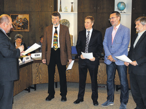 Vereidigung der neuen Gemeinderatsmitglieder: von links Bürgermeister Manfred Hofmann, die langjährige zweite Bürgermeisterin Heidrun Kaltenhäuser (im Hintergrund), Karl-Josef Raab-Seibold, Alexander von Ciriacy-Wantrup, Theodor Pleyer und Hermann Frank