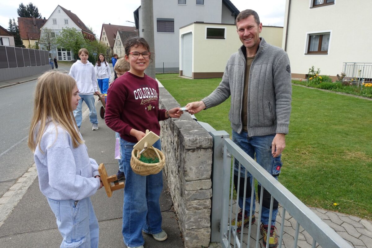 Dabei „schlattern“ sie nach Kräften und erinnern mit dem entstehenden Lärm die Gläubigen an das Angelusgebet. Bei ihrer letzten „Schlatterrunde“ am Samstagmittag ziehen die „Schlatterer“ dann von Haus zu Haus und bekommen von den Bewohnern ihren „Schlatterlohn“ – in Form von Ostereiern, Süßigkeiten oder Geld.