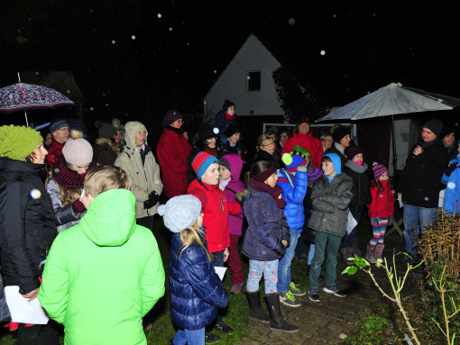 Der einsetzende Nieselregen und die kühlen Temperaturen hielten die gut beschirmten Gäste nicht davon ab, nach einem gemeinsam gesungenen „Alle Jahre wieder“ den Abend bei Plätzchen und einem nachbarlichen Plausch ausklingen zu lassen.