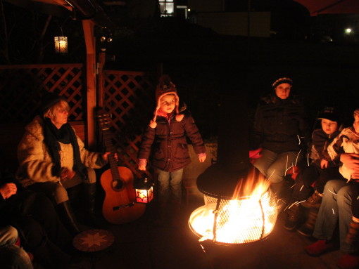 Zum Beispiel Familie Sciortino, die erst vor kurzem nach Schnaittach gezogen ist. Gabriela Sciortino hofft so, auch Kontakt zu den Bürgern herzustellen. Mit ihrer lebendig erzählten Geschichte von Frieder, der Weihnachten kaum noch erwarten kann und am Ende sogar seine Hausschuhe in Brand steckt, hat sie es jedenfalls geschafft, dass die Kinder still und aufmerksam zuhörten. Irmi Vollmuth hatte ihre Gitarre mitgebracht und sorgte mit ihren Mitmachliedern für Aufmerksamkeit. Eine heimelige Atmosphäre schaffte dabei das wärmende Feuer.