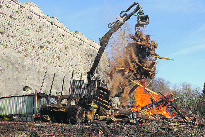 ROTHENBERG — Nach den Durchforstungsmaßnahmen, die auch auf der Ostseite der Festungsruine am Rothenberg stattfanden (die PZ berichtete), folgte nun eine Aufräumaktion auf dem flachen Areal außerhalb der mächtigen Festungsmauern. Dort standen unter anderen eine alte Blechgarage, ein uralter Traktoranhänger sowie ein mittlerweile baufälliger ehemaliger Ziegenstall. Auch sonstiger Unrat, wie alte Autoreifen und Sperrmüll, hatte sich im Laufe der Jahrzehnte auf dem nicht für Besucher zugänglichen Bereich angesammelt. Der Abfall wurde sortiert und wird nun nach und nach entsorgt. Das Holz des Ziegenstalls und weitere Holzabfälle wurden gleich vor Ort verbrannt. Nun kommt die Festung, die über die Weihnachtsfeiertage erstmals wieder beleuchtet wurde, noch besser zur Geltung.