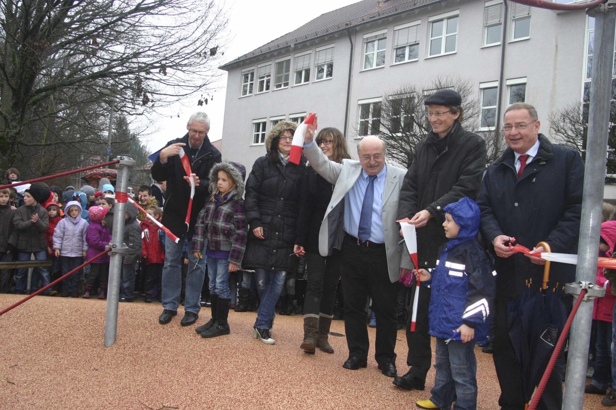 Schulleiter Sturm (Mitte) freute sich zusammen mit seinem Vertreter Konrektor Krebes (links), den Elternbeiratsvorsitzenden, Planer Riedel (2.v.r.), Bürgermeister Ernstberger (rechts), dem Kollegium der Grundschule und allen 250 Kindern darüber, dass der neue Klettergarten endlich genutzt werden kann. Foto: Blinten2010/11/klettergarten.jpg