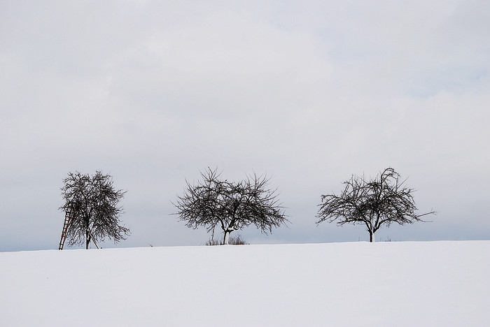 Ab Enzenreuth – dem auf dem Hochplateau (520 Meter) gelegenen Ortsteil der mittelfränkischen Marktgemeinde Schnaittach – halten wir uns an das Wegezeichen „Rotes Andreaskreuz“. Der Weg über die Einsamkeit der verschneiten Hochebene, bietet wunderbare Landschaftseindrücke. Die Bäume still und starr mit Schneeflaum bedeckt, strecken ihre kahlen Äste dem Winterhimmel entgegen. Es ist die Ruhe, die beim langsamen Stapfen so gut tut.