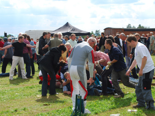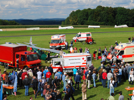 Sofort zur Stelle waren zwei Sanitätsfahrzeuge, die für den „normalen“ Dienst am Flugtag abgestellt waren. Auch einige Ärzte aus dem Publikum kümmerten sich um die Verletzten, bis unzählige weitere Rettungswagen aus dem gesamten Landkreis über die schmale Straße von Freiröttenbach hinauf nach Lillinghof kamen. Vier Rettungshubschrauber landeten. Die Feuerwehren aus Lauf, Schnaittach, Freiröttenbach und Lillinghof übernahmen das Absperren der Unfallstelle. Immer wieder ertönten per Lautsprecher Durchsagen von Menschen, die auf der Suche nach ihren Angehörigen waren, darunter auch Kinder. Vor allem Besuchern, die das Unglück aus nächster Nähe miterlebt hatten, stand der Schock ins Geschicht geschrieben.