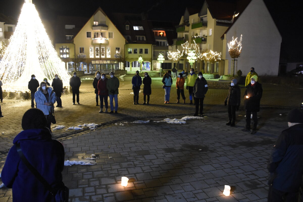 Rund 50 Menschen blieben währenddessen schweigend auf dem Rathausplatz stehen, im Schein der Kerzen, die im Kreis auf den Boden aufgestellt waren. Einige der Anwesenden hielten Kerzen in der Hand. Sie waren Teilnehmer der Mahnwache zum Gedenken an die Corona-Toten, zu der die Eckentaler Grünen aufgerufen hatten. Die stille Versammlung war gleichzeitig Gedenkfeier und Gegendemonstration.