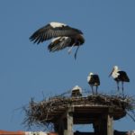 Diese Aktion ist derzeit täglich mehrmals in Lauf zu beobachten. Mama oder Papa Storch fliegen vom Horst regelmäßig auf die Giebelspitzen der Sandsteingebäude der Stadtapotheke oder des ehemaligen Heka-Hauses immer in Sicht- und „Klapper“-Weite zum Nest.