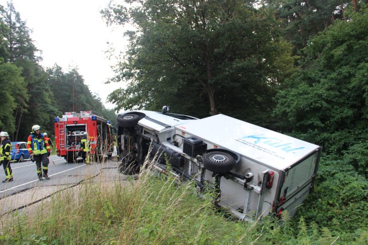 Hier wollte ein 20-jähriger italienischer Fahrer seinen Kühltransporter wenden und bog deshalb rechts in eine nur wenige Meter asphaltierte Einmündung eines Feldwegs ein. Beim Wendevorgang unterschätzte der Mann wohl die Fahrzeuglänge und rutschte deshalb mit der Hinterachse auf Schotter die Böschung hinab, bis der Kleinlaster schließlich auf die Seite kippte.