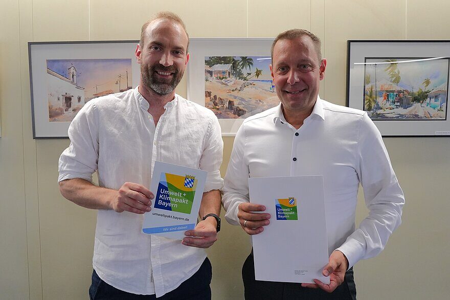 Landrat Armin Kroder (rechts) übergab stellvertretend für den Bayerischen Umweltminister Thorsten Glauber die Umweltpakt-Urkunde an Michael Fischer. | Foto: LRA2025/07/csm_Umweltpakt_wsfischer_47c80e2106.jpg